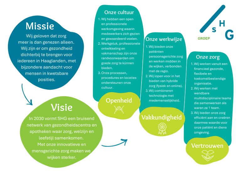 Bij SHG geloven wij dat zorg meer is dan genezen alleen. Wij zijn er om gezondheid dichterbij te brengen voor iedereen in de regio Haaglanden, met bijzondere aandacht voor mensen in kwetsbare posities. In onze gezondheidscentra en apotheken komen zorg, welzijn en leefstijl samen.